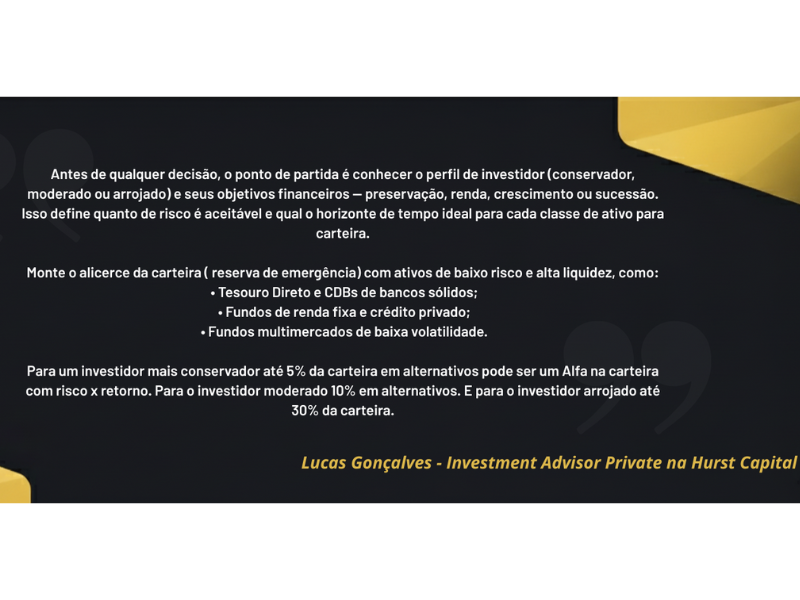 Isso significa diversificar com inteligência, entre renda fixa, variável e, principalmente, ativos capazes de gerar performance independente do mercado.